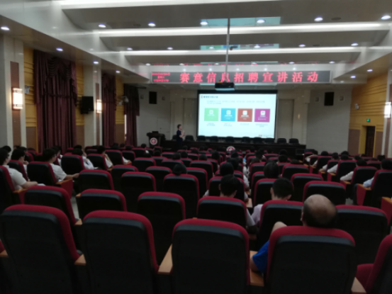 随后,在外语楼北311报告厅,黄奇经理为我院15级学生介绍了企业情况、实习生培养模式、实习生晋升空间等情况。我院15级同学踊跃报名,并参加了之后的在线测试和现场面试活动。